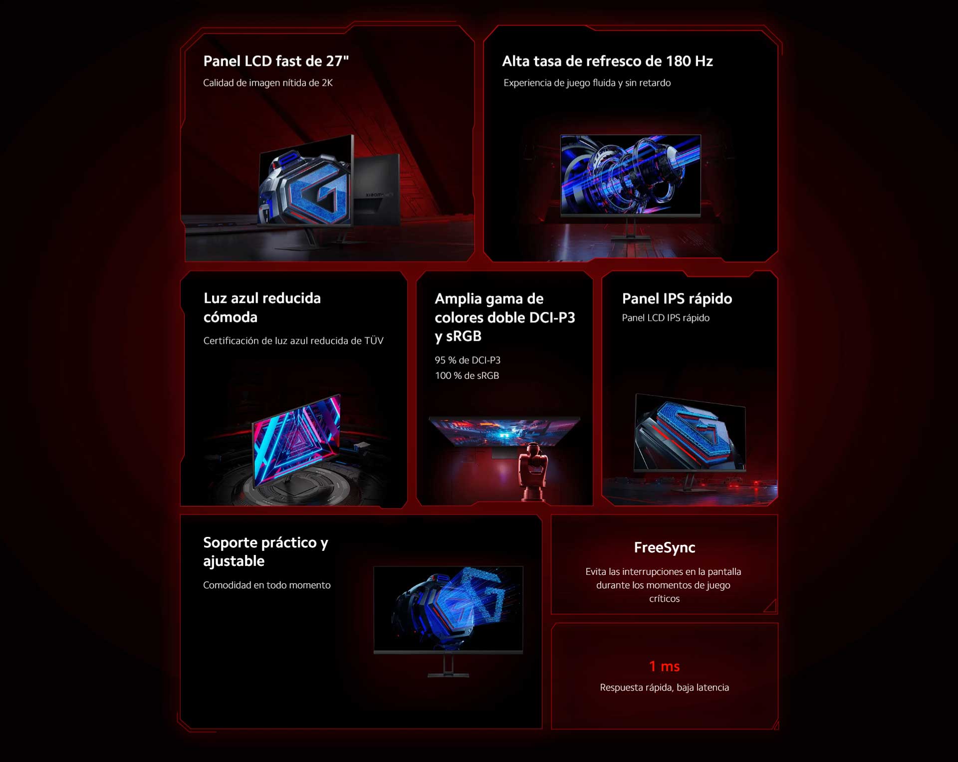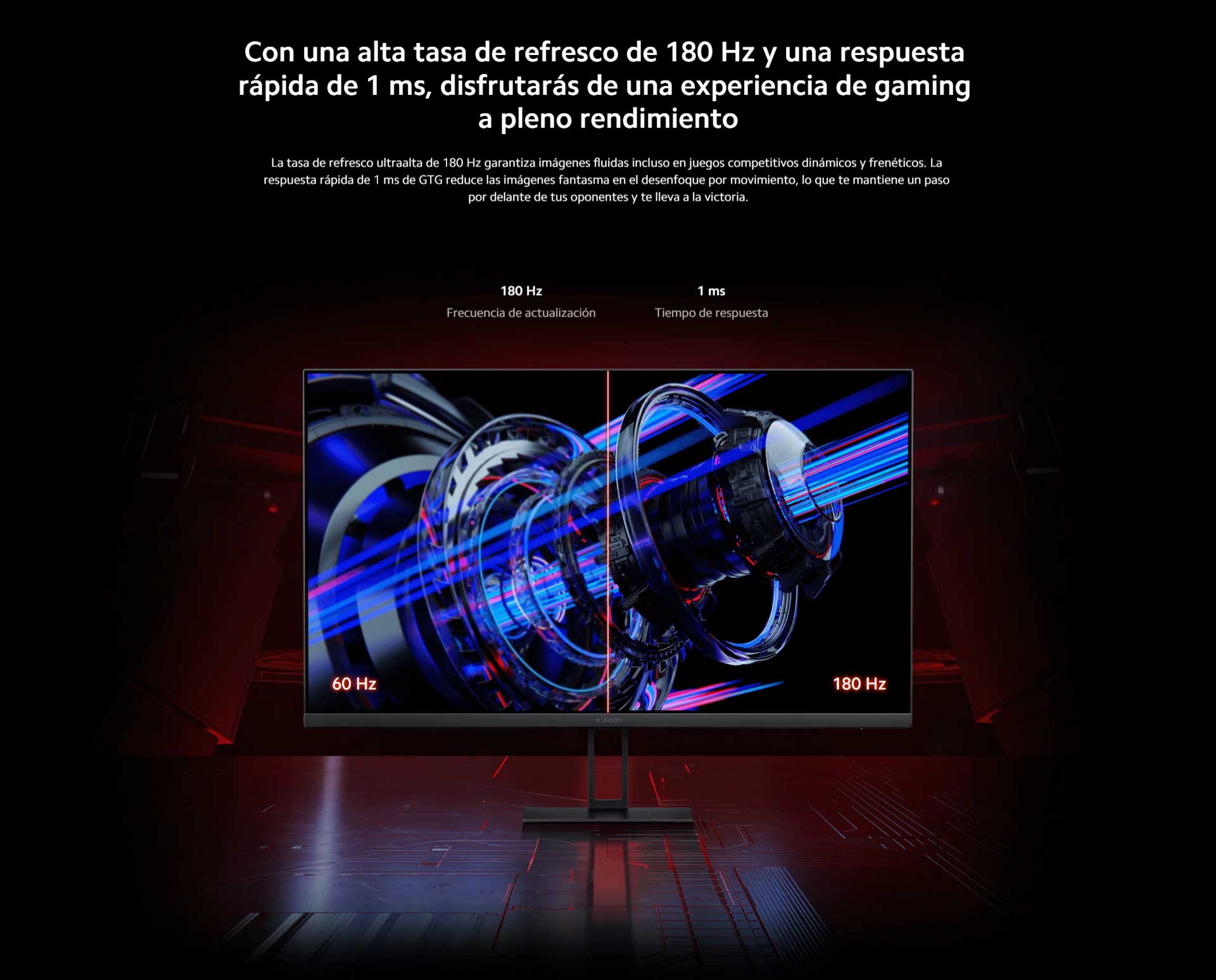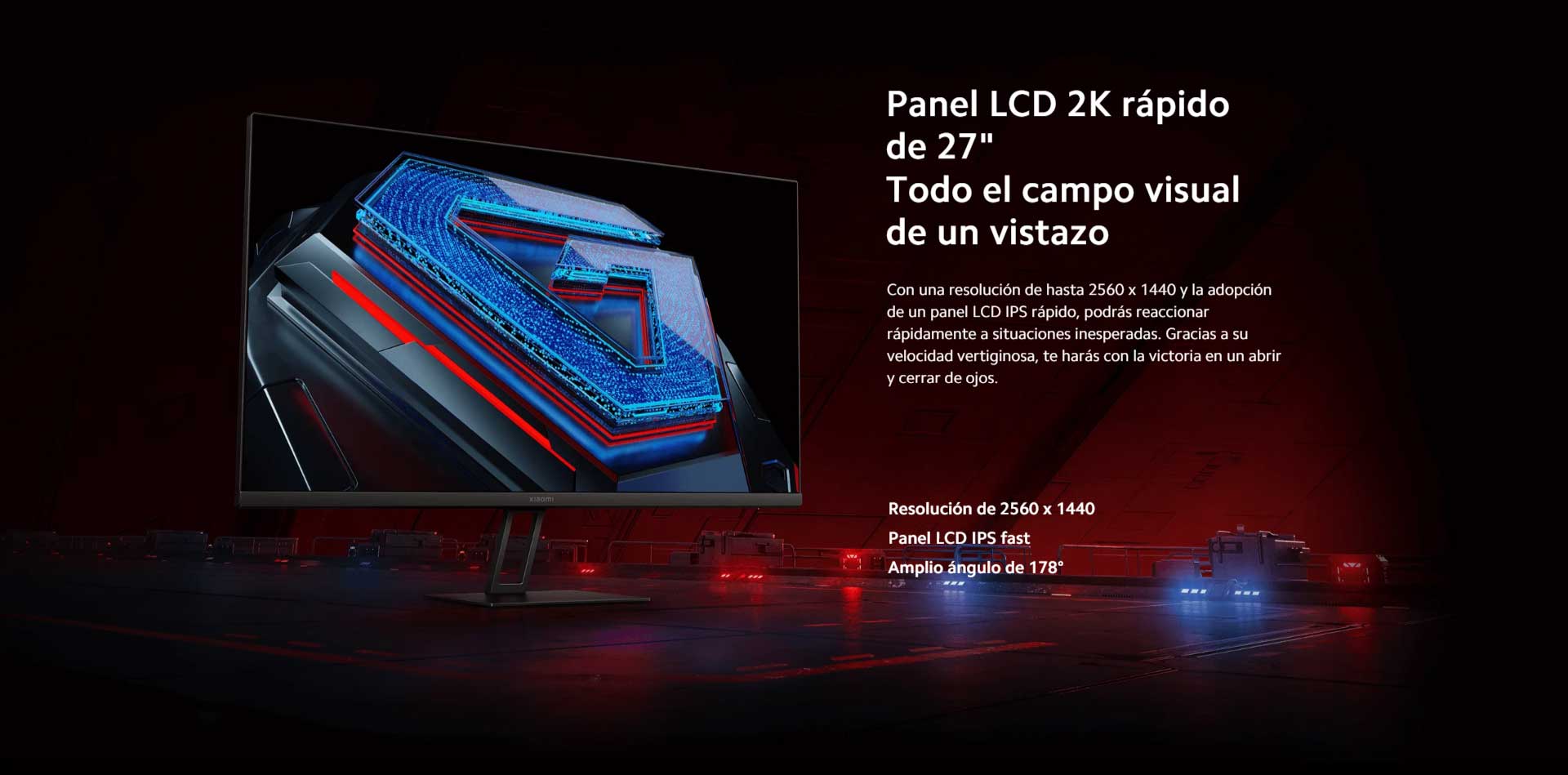 El monitor Xiaomi G27Qi Gaming ofrece una experiencia de juego inmersiva gracias a su resolución 2K, frecuencia de actualización de 180 Hz y tiempo de respuesta de 1 ms. Su pantalla IPS de 27" proporciona colores vibrantes, amplio ángulo de visión y protección ocular certificada para sesiones prolongadas. Un diseño ergonómico y múltiples puertos completan este monitor versátil, ideal para gaming y entretenimiento.