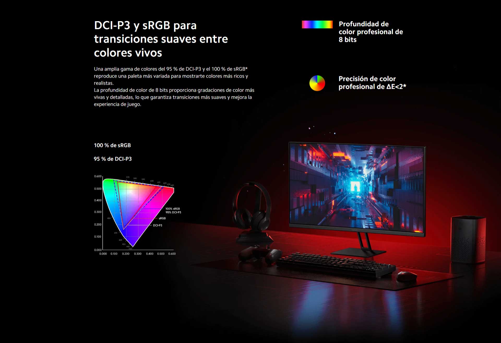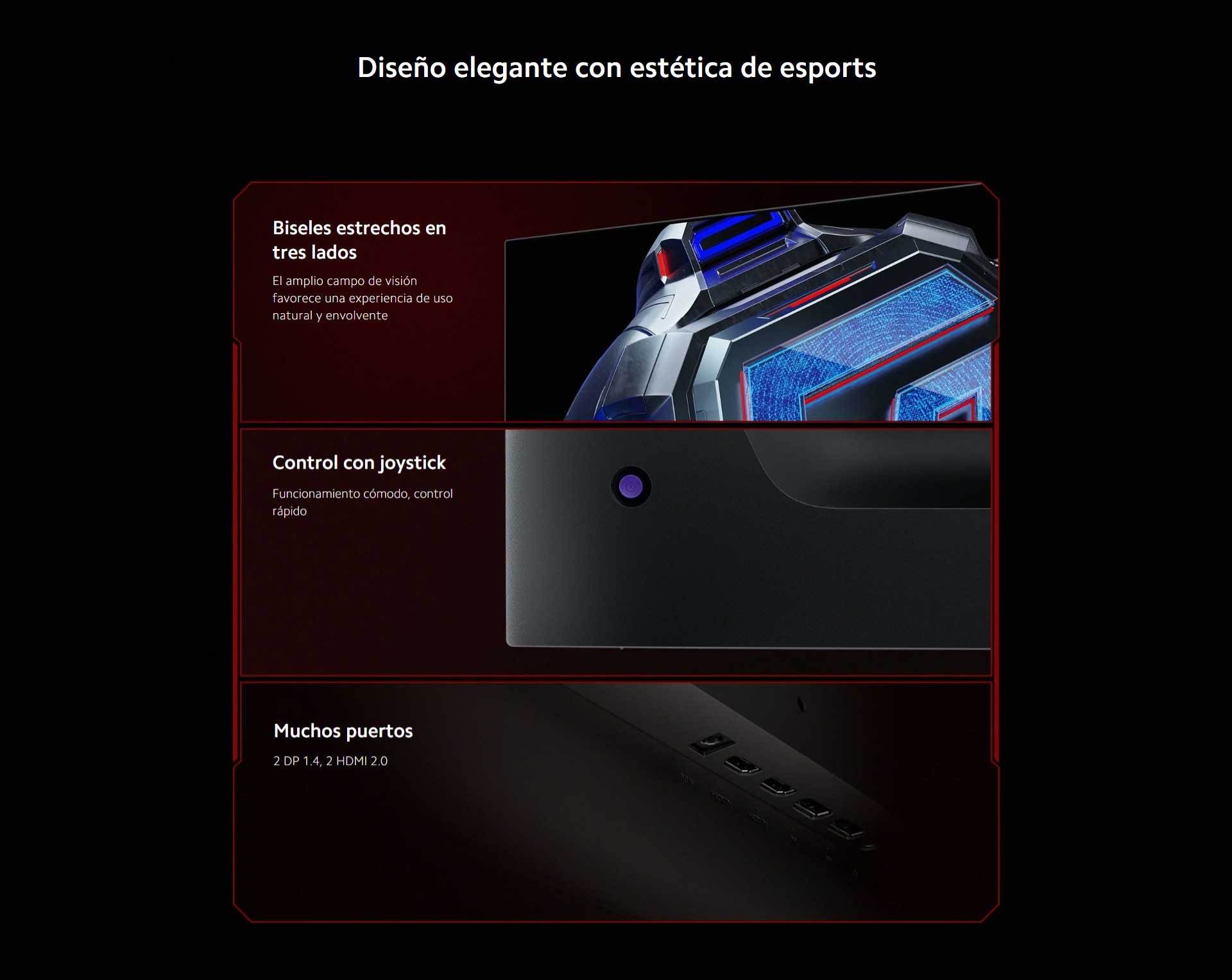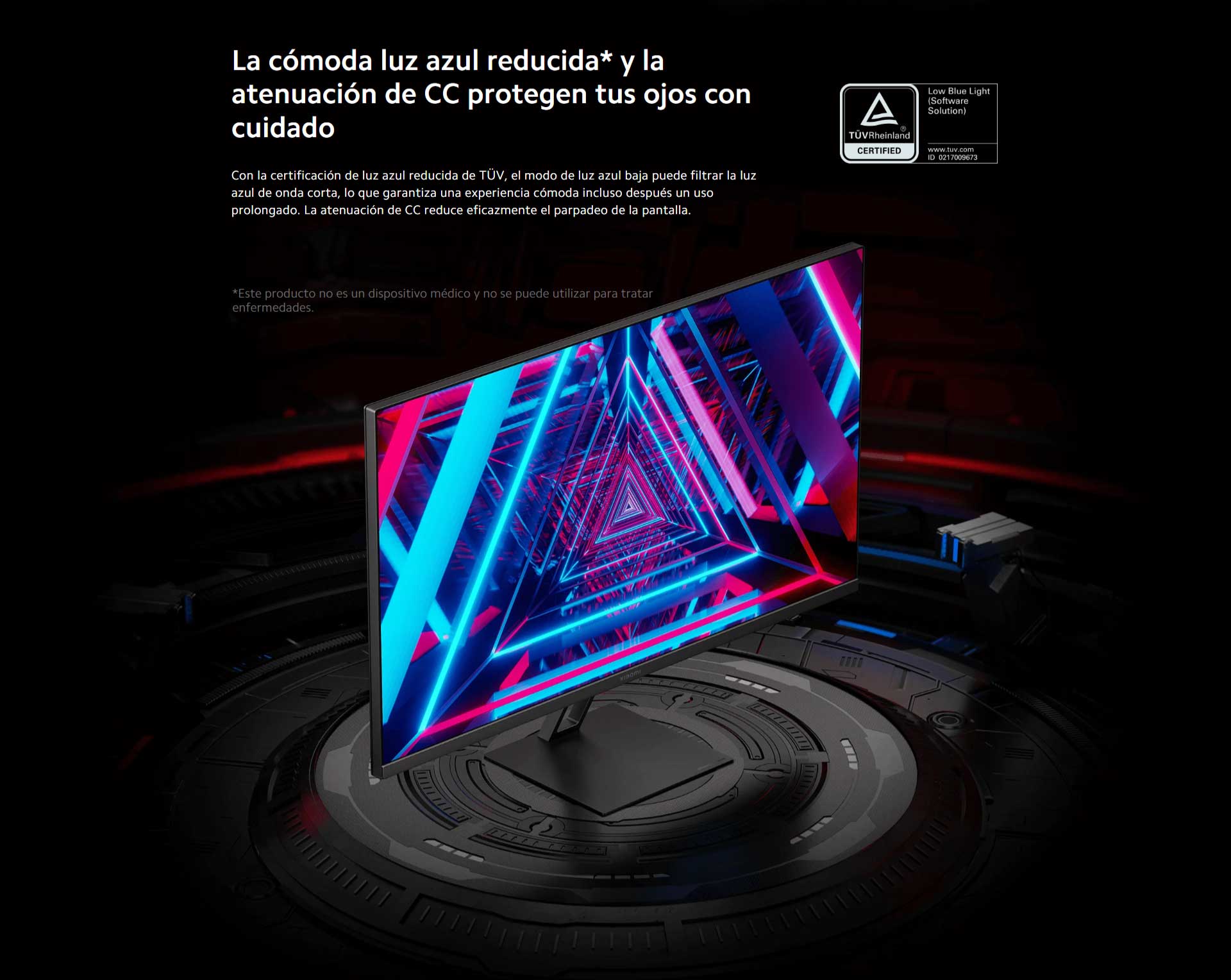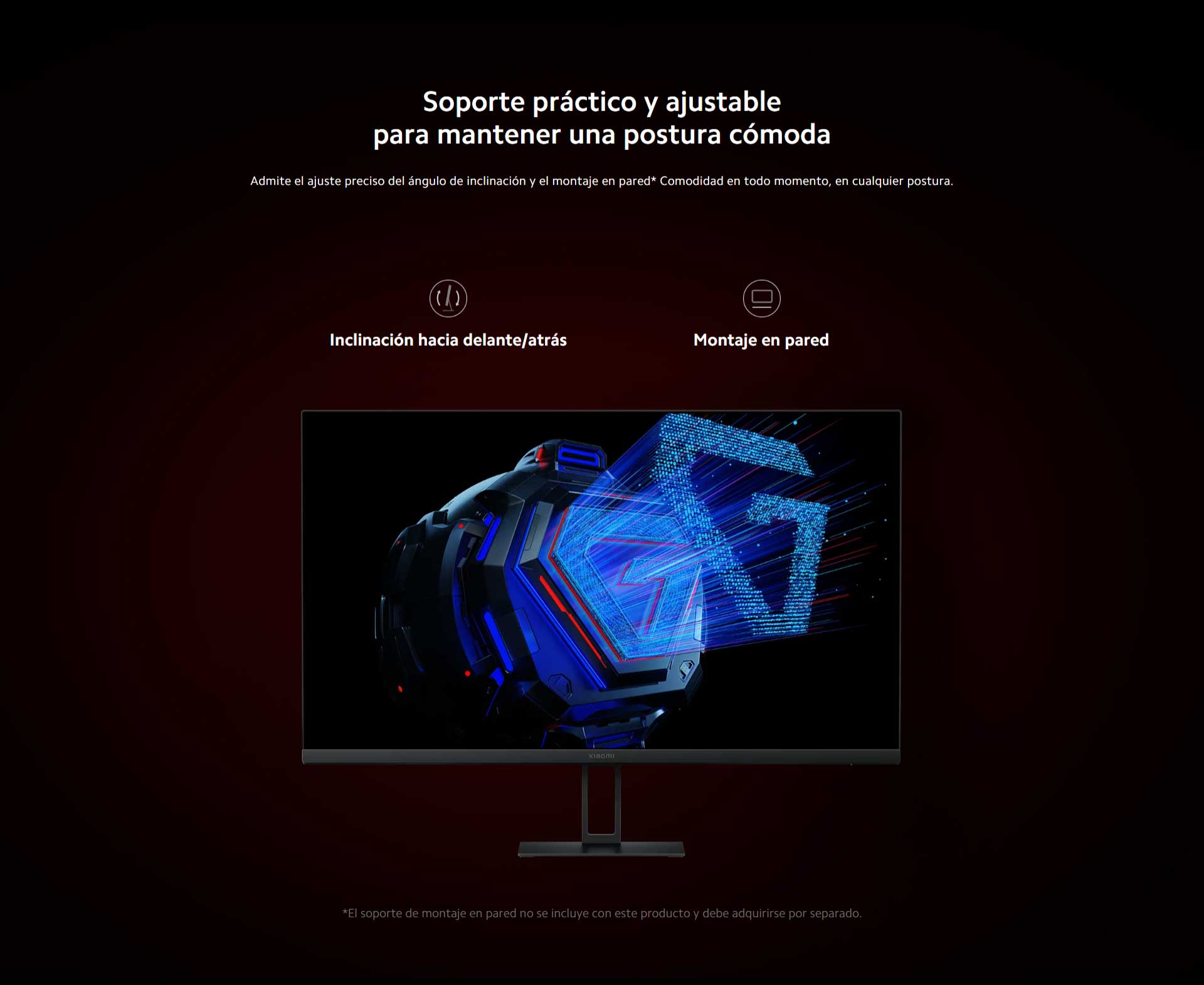 El monitor Xiaomi G27Qi Gaming ofrece una experiencia de juego inmersiva gracias a su resolución 2K, frecuencia de actualización de 180 Hz y tiempo de respuesta de 1 ms. Su pantalla IPS de 27" proporciona colores vibrantes, amplio ángulo de visión y protección ocular certificada para sesiones prolongadas. Un diseño ergonómico y múltiples puertos completan este monitor versátil, ideal para gaming y entretenimiento.
