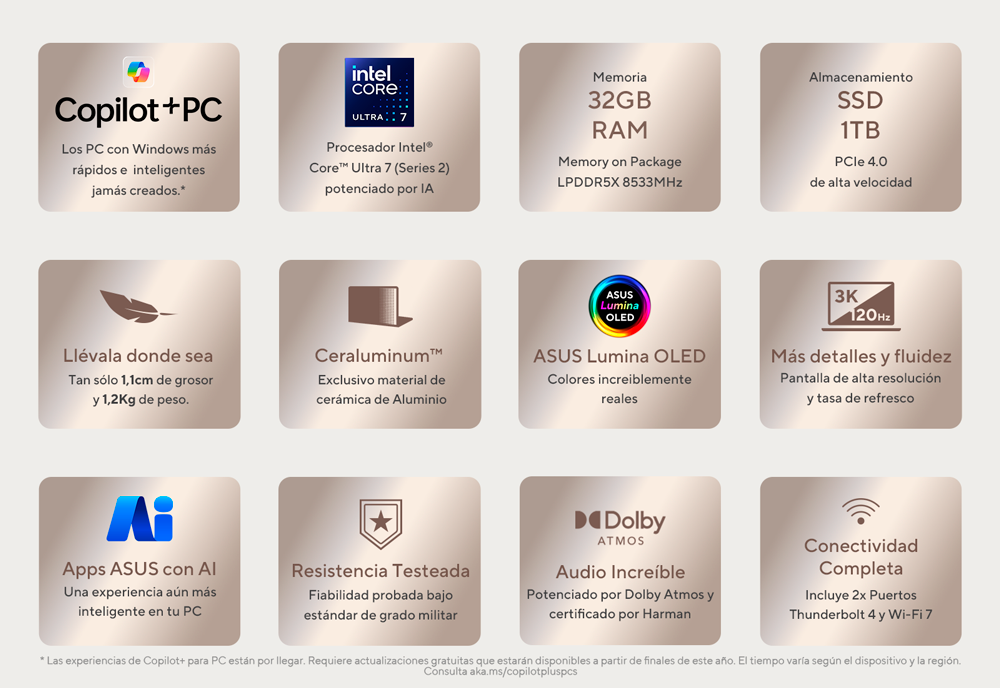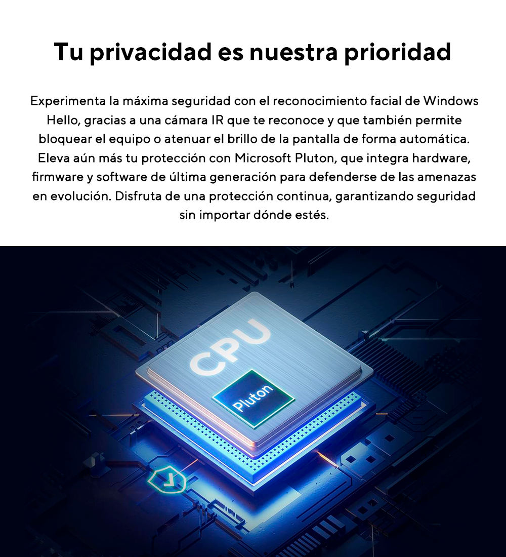 • Procesador: Intel Core Ultra 7 Processor 258V 32GB 2.2 GHz (12MB Cache, up to 4.8 GHz, 8 cores, 8 Threads); Intel AI Boost NPU up to 47.